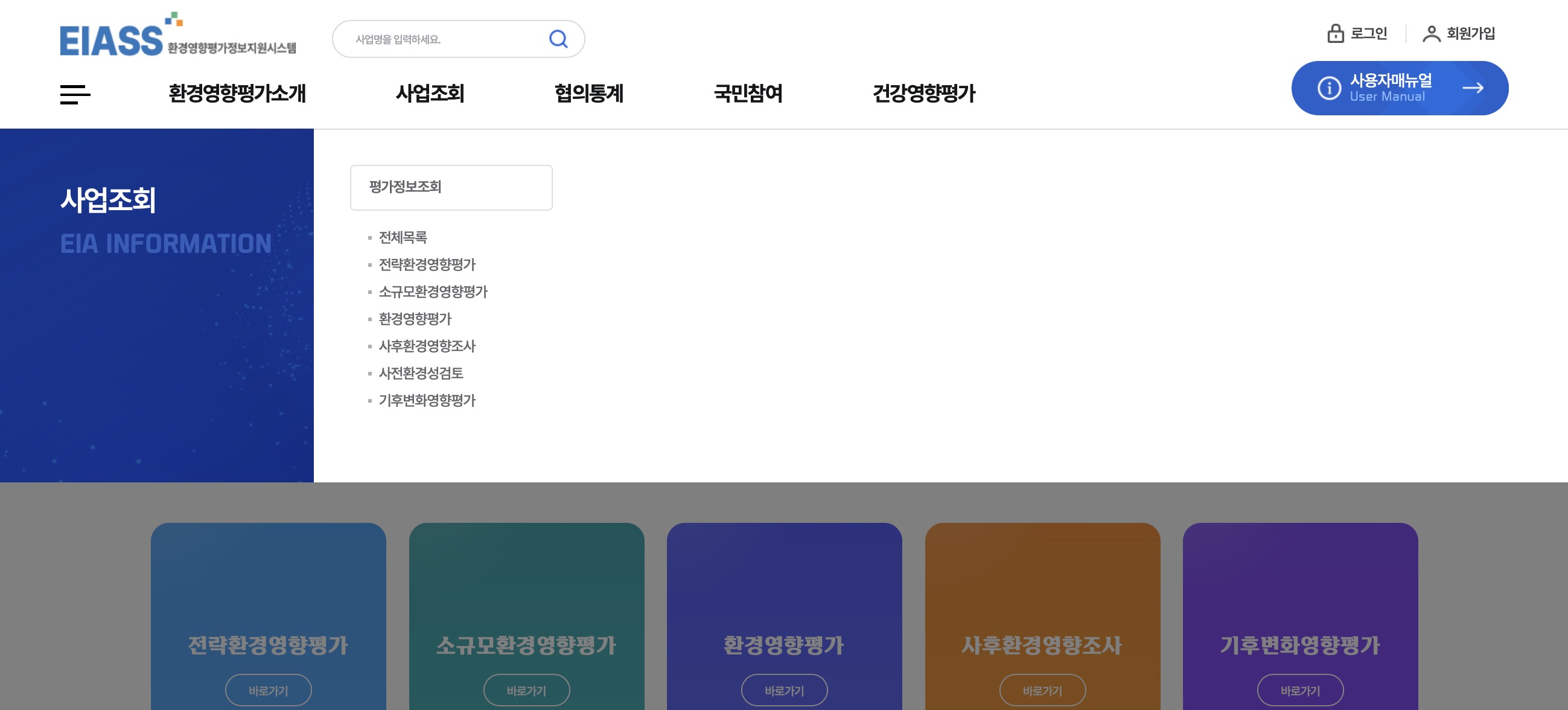 - 사업정보 조회: 환경영향평가 대상사업에 대한 기본 정보와 진행 상황을 조회할 수 있습니다.